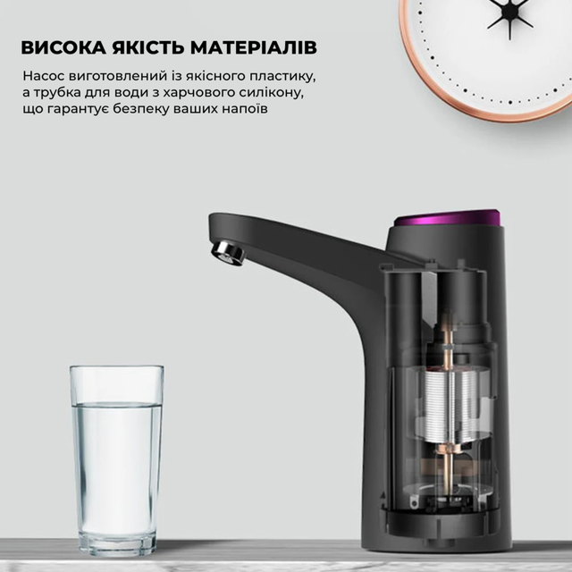 - Висока якість матеріалів. Насос виготовлений із якісного пластику, а трубка для води з харчового силікону, що гарантує безпеку ваших напоїв. Ви можете бути впевнені в надійності та безпеці з цією зручною помпою. Електричний насос підходить для більшості стандартних пляшок, що робить його універсальним вибором для вашої кухні або офісу.