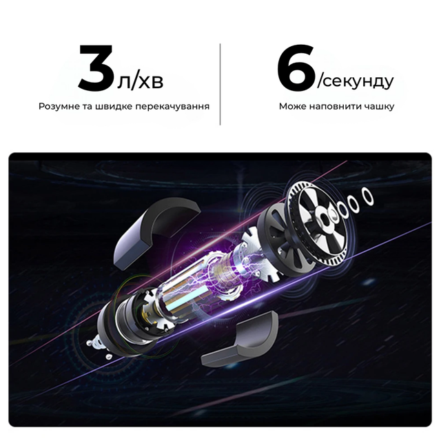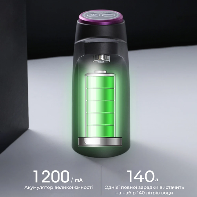 Живлення від літієвого акумулятора 1200 мА. На повному заряді акумулятора помпа може перекачати від 3 пляшок води. Інтерфейс MicroUSB-роз'єм. Кабель MicroUSB-USB йде в комплекті. Час заряджання до 3 годин.