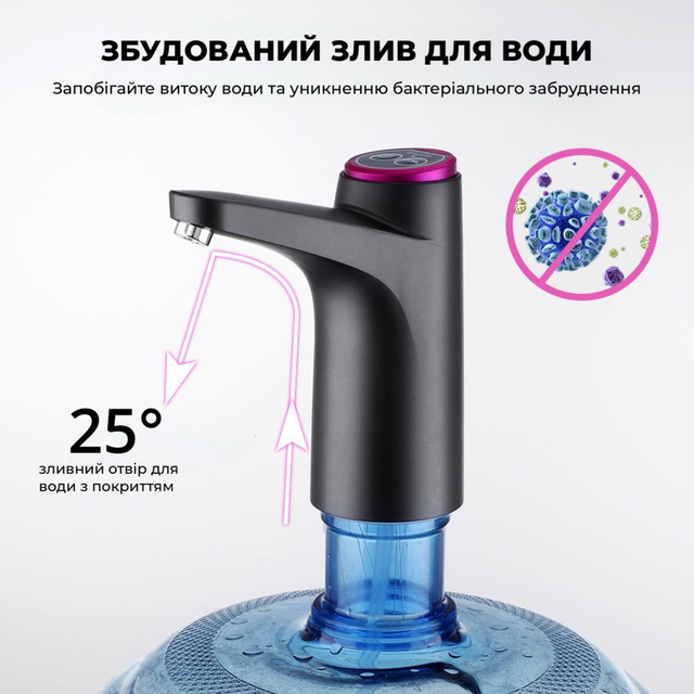 - Зручність у кожному натисканні. Набирайте воду легко одним натисканням. Електричний насос також обладнаний окремою кнопкою для набору 600 мл води, що дає змогу точно виміряти кількість, що тебується.