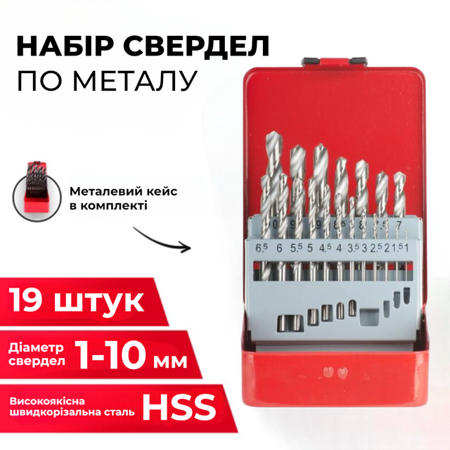 - Набір свердл по металу HSS 19 штук: 1.0; 1,5; 2.0; 2,5; 3.0; 3,5; 4.0; 4.5; 5.0; 5.5; 6.0; 6.5; 7,0; 7,5; 8.0; 8.5; 9,0; 9,5; 10.0