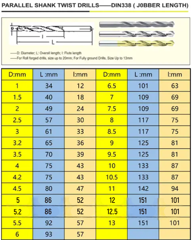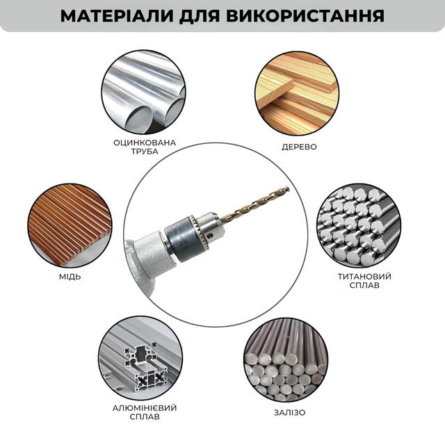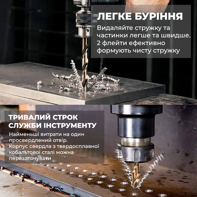 Свердла виготовлені із швидкорізальної сталі. Свердлять сталь, кольорові та нержавіючі метали (алюміній), сірий ковкий чавун, а також тверді пластмаси. Гостро заточування - 118 ° чудово показує себе в роботі.