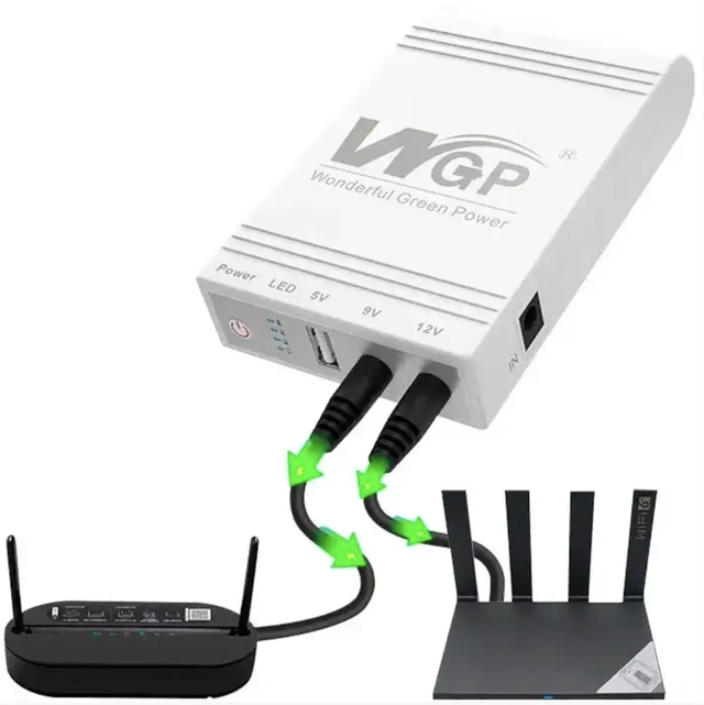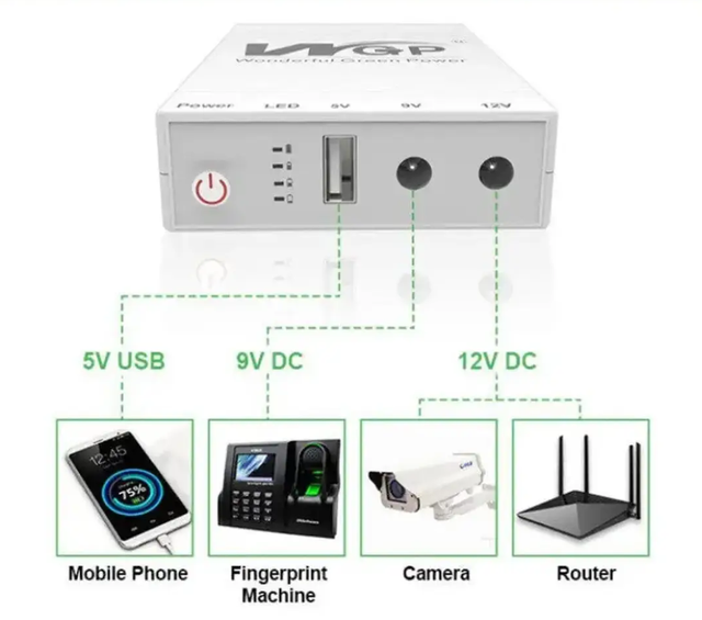 Джерело безперебійного живлення міні-UPS для роутера ємністю 38.48wH/10400mAh на 5V/9V/12V - пристрій, який дозволить медіа конвертору та роутеру продовжувати роботу під час відключення електрики до 20 годин. Має 2 вбудовані виходи DC на 9 та 12 вольт, USB 5 в, а також набір проводів та перехідників у комплекті. Mini UPS WGP призначений для забезпечення аварійного резервного живлення всіх видів постійного струму, таких як маршрутизатори, модеми, телевізійні приставки, телефонні системи VOIP, системи спостереження, системи сигналізації, системи персонального зв'язку, радіо, цифрові камери, POS-термінали, пристрої Bluetooth, смарт-карти та інше телекомунікаційне обладнання.